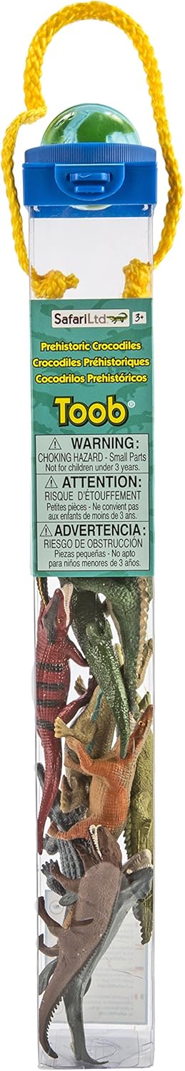 Prehistoric crocodiles thrived in the wetlands of the ancient Sahara 100 million years ago. The first specimens of these prehistoric creatures were called Sarcosuchus. Our miniature models realistically depict these ancient beings. This TOOBS includes a Postosuchus, a Desmatosuchus, an Euparkeria, a Montealtosuchus, a Champsosaurus, a Sarchosuchus, a Chasmatosaurus, a Rutiodon Validus, a Dakosaurus and a Pristichampsus. Educational leaflet included for your learning pleasure. Each mini figure is carefully sculpted and finely painted by hand to ensure optimum quality for years of learning fun. For added play value this collection is packaged in a reusable acetate tube.
