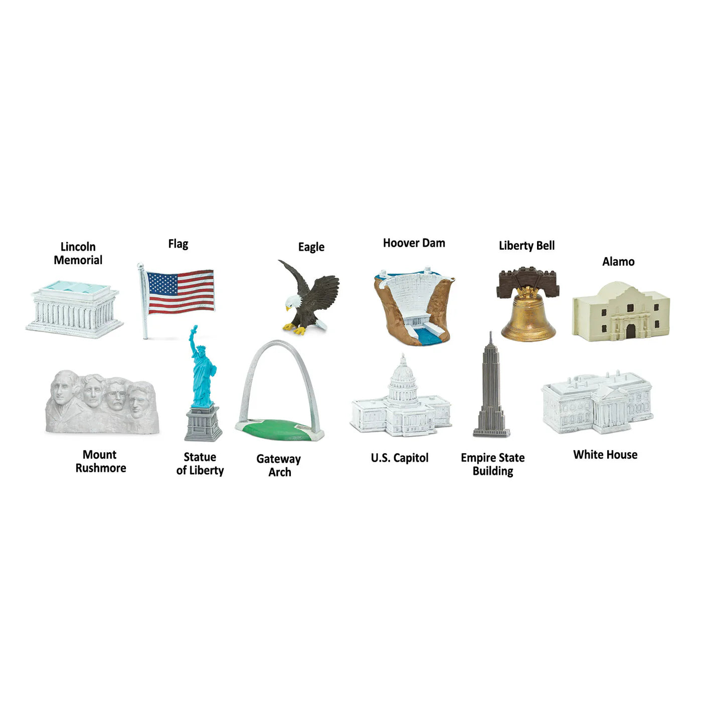 This Toob includes figurines of the Lincoln Memorial, Hoover Dam, Liberty Bell, Alamo, Mount Rushmore, Statue of Liberty, Gateway Arch, U.S. Capital, Empire State Building, White House, as well as a flag and an eagle.