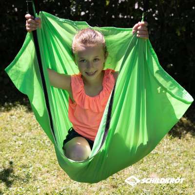 The innovative hammock swing from Schildkröt combines a hanging chair, a cave, and a nest swing. It offers children swinging fun, a place to retreat, and a sense of security both indoors and outdoors. The swing cloth, made of durable and weather-resistant polyester, measures 1.45 x 1.35 m and offers plenty of space. The two support ropes made of robust PE are adjustable (max. length 120 cm). Since the swing cloth is also attached to the bottom of the ropes, this results in a maximum length of 200 cm. The swing is easily hung using two pre-mounted stainless steel O-rings; no tools are required for assembly.
