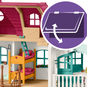 1 x house, 1 x horse stable, 1 x balcony, 1 x girl, 1 x mother, 1 x father , 1 x Quarter Horse Cayenne, 1 x Hanoverian stallion Jupiter, 2 x kitten, 1 x double bed with mattress, 2 x bunk bed with mattresses, 1 x bunk bed ladder, 4 x fabric blankets, 6 x fabric cushions, 1 x bedside table, 1 x bedside lamp, 1 x toilet, 1 x sink, 1 x shower, 2 x bench, 1 x kitchen unit, 1 x fridge, 1 x pot, 1 x pan, 1 x fruit box, 4 x bottle, 4 x plate, 4 x cups, 4 x piece of apple pie, 1 x dining table, 1 x plate rack, 1 x stairs, 1 x chimney, 1 x wood pile, 1 x floor lamp, 1 x case, 1 x telescope, 2 x balcony chair, 1 x balcony table, 1 x sunshade, 3 x flower box with flowers, 1 x coffee table, 1 x sofa, 1 x flower pot, 1 x bouquet of flowers, 1 x cat bowl, 1 x golden key, 1 x carrot, 1 x oven, 2 x manger, 2 x trough, 2 x saddle holder, 4 x paddocks, 1 x grooming box, 1 x curry comb, 1 x horse brush, 2 x apples, 1 x pitchfork, 1 x saddle, 1 x bridle and reins, 2 x hay, 3 x rosettes, 1 x trophy, 2 x boxwood in a tub, 1 x horse weathervane, 2 x flag, 1 x well, 1 x hose holder with water hose, 1 x sticker, 1 x assembly instructions