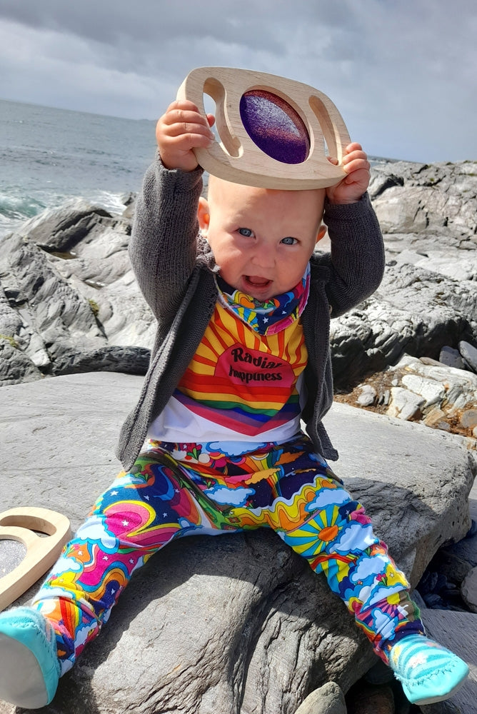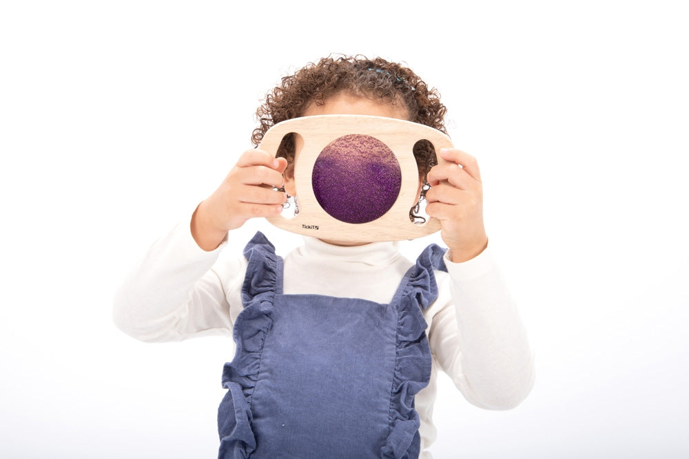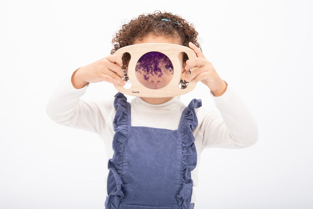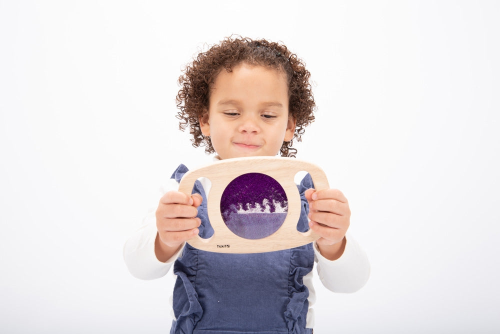A solid rubberwood frame with easy hold handles enclosing a panel of sparkling purple glitter. The panel can be twisted and turned to make the glitter liquid move and flow in fascinating ways. Ideal for sensory discovery and broadening descriptive vocabulary.