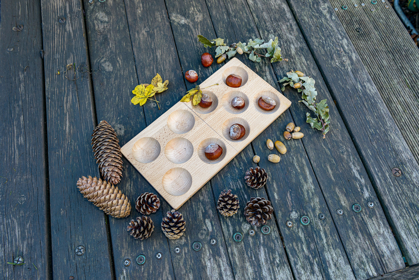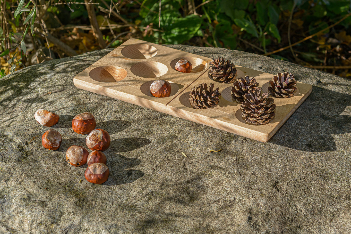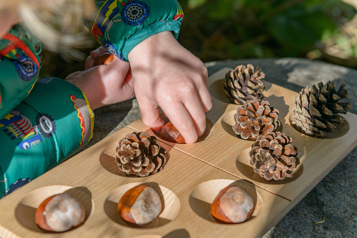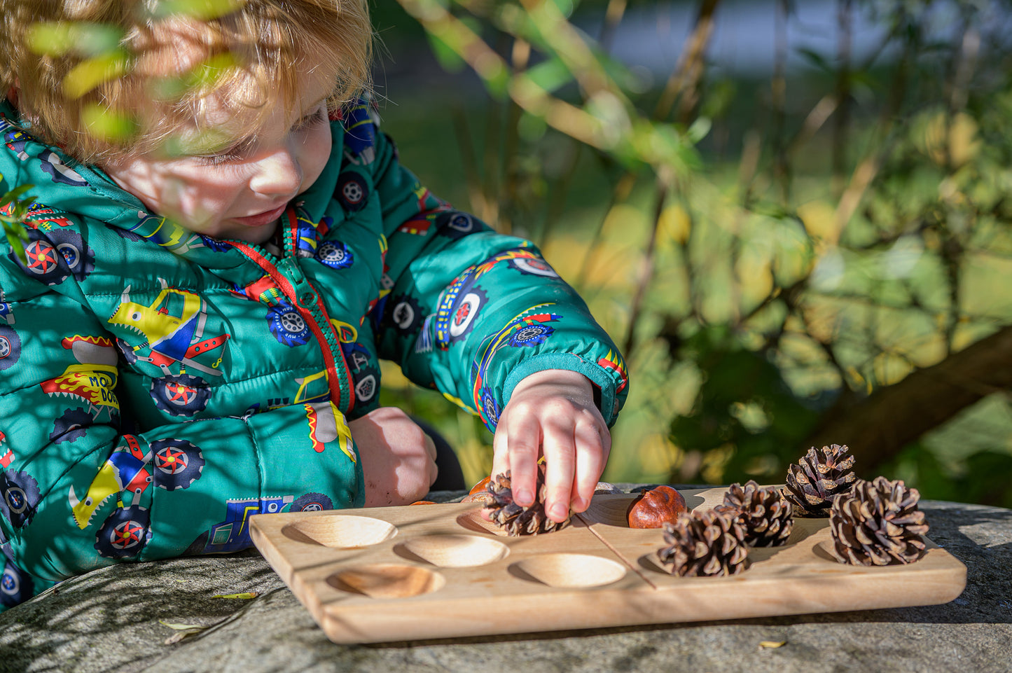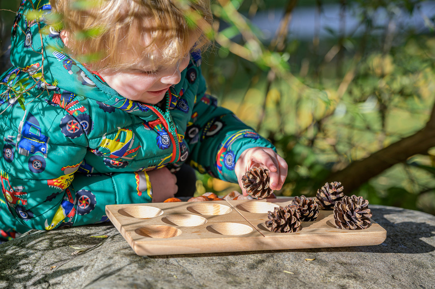 This engaging wooden tray offers a different representation of a 10-frame enabling children to explore number patterns to 10 in a new way. Divided into two identical halves, the familiar dice layout for 5 helps them subitise and develop early counting and number bonds skills in a fun, tactile and highly visual way. Use one tray to explore numbers up to 10 or combine two trays for numbers up to 20. Ideal to use with Two-Tone Counting Stones. Made from sturdy FSC beech. Size: 315 x 160mm. Safe for children aged 18mths+.