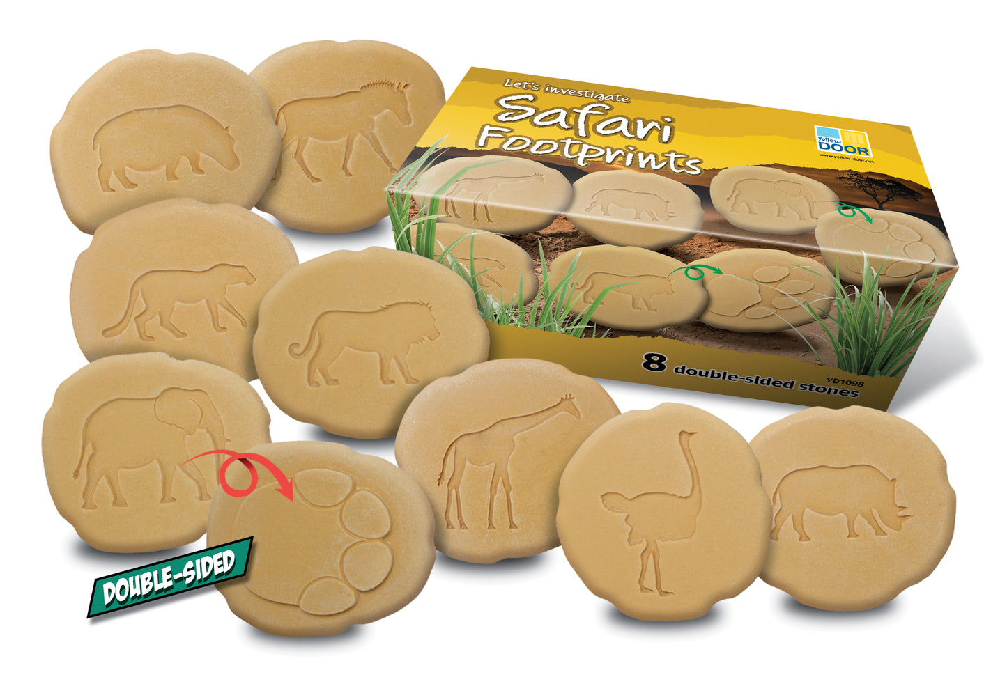 Take a walk on the wild side and explore what animals you might find on the African savannah as you follow their tracks. Each stone has a raised footprint on one side and the related creature in relief on the other. Watch out for the following animals: lion, elephant, rhinoceros, giraffe, hippopotamus, ostrich, cheetah and zebra. Made from a durable stone and resin mix, the footprints can be used in sand, water and soil, and are easily washed clean for a new adventure. Contains eight double-sided stones measuring 70-80mm.
