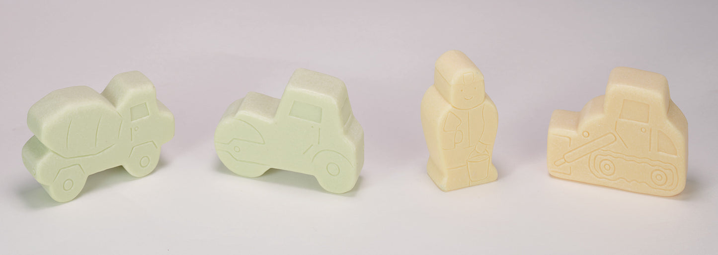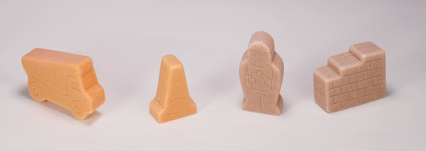 Let’s build a story with this charming set of eight stone construction people, props and vehicles. Construction play is a popular element of small world and imaginative play, and this set will inspire many adventures. The stones are beautifully etched and engraved, and are tough enough to be used outdoors in sand, mud or water. The set includes one each of the following: bulldozer, concrete mixer, dumper truck, road roller, female worker, male worker, partially-built brick wall, and traffic cone. Maximum length 75mm. Safe for age 2+.