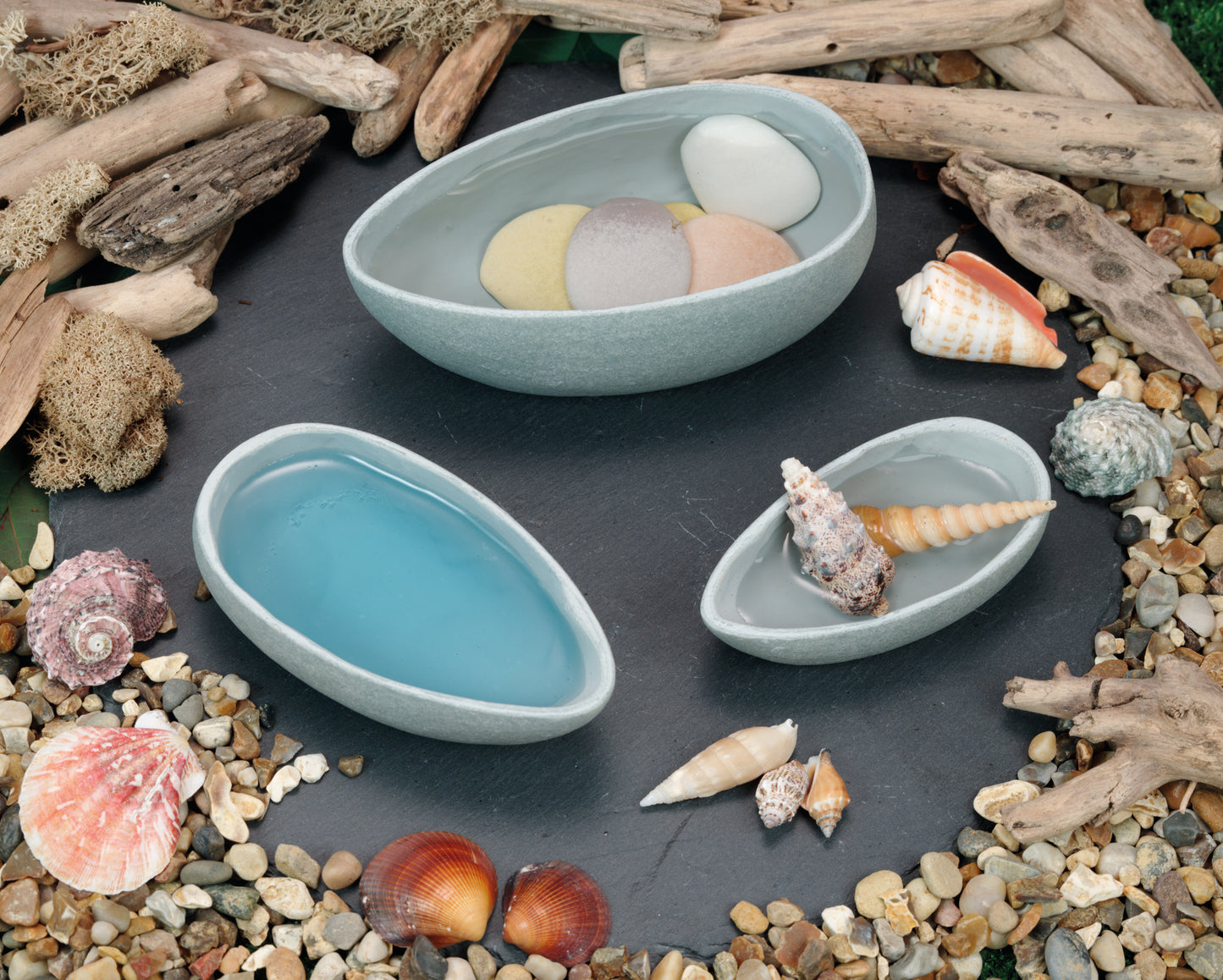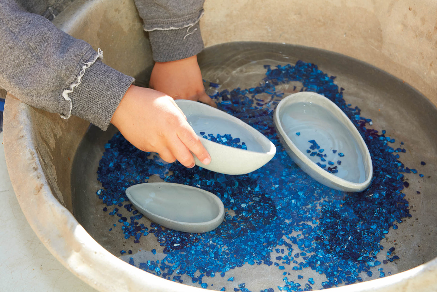 These charming rustic pourers are robust enough to be used outside with a range of materials and will enhance sand, water and muddy play. Easy to hold, they can be used to scoop and pour liquids and solids. Ideal for exploring and comparing volumes, the shaped lip makes pouring intuitive and easy for young learners. Set includes three tactile pourers measuring between 105-145mm. Safe for children aged 18 months+.