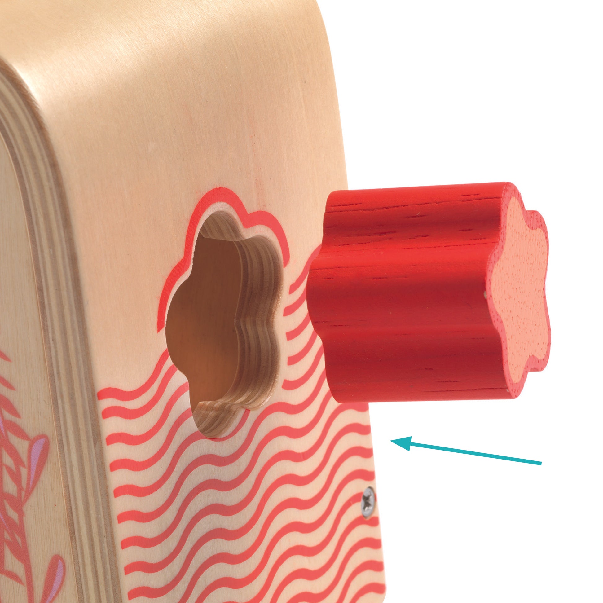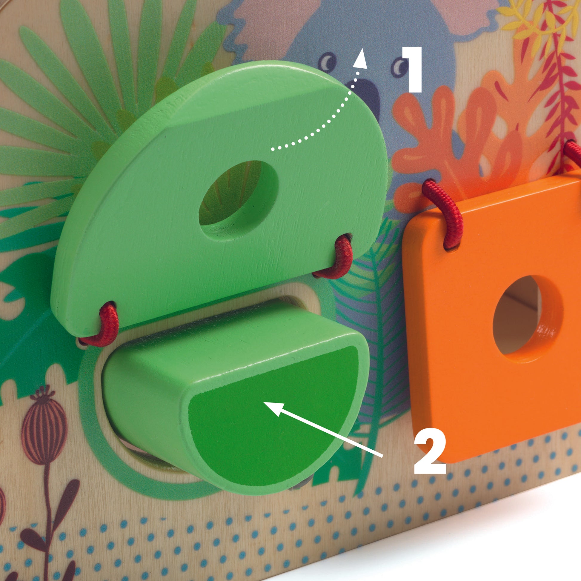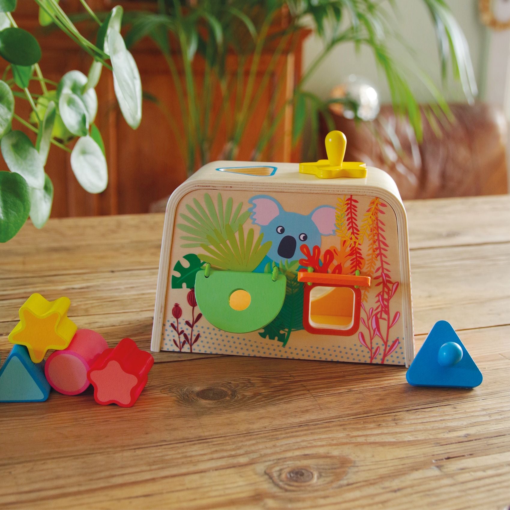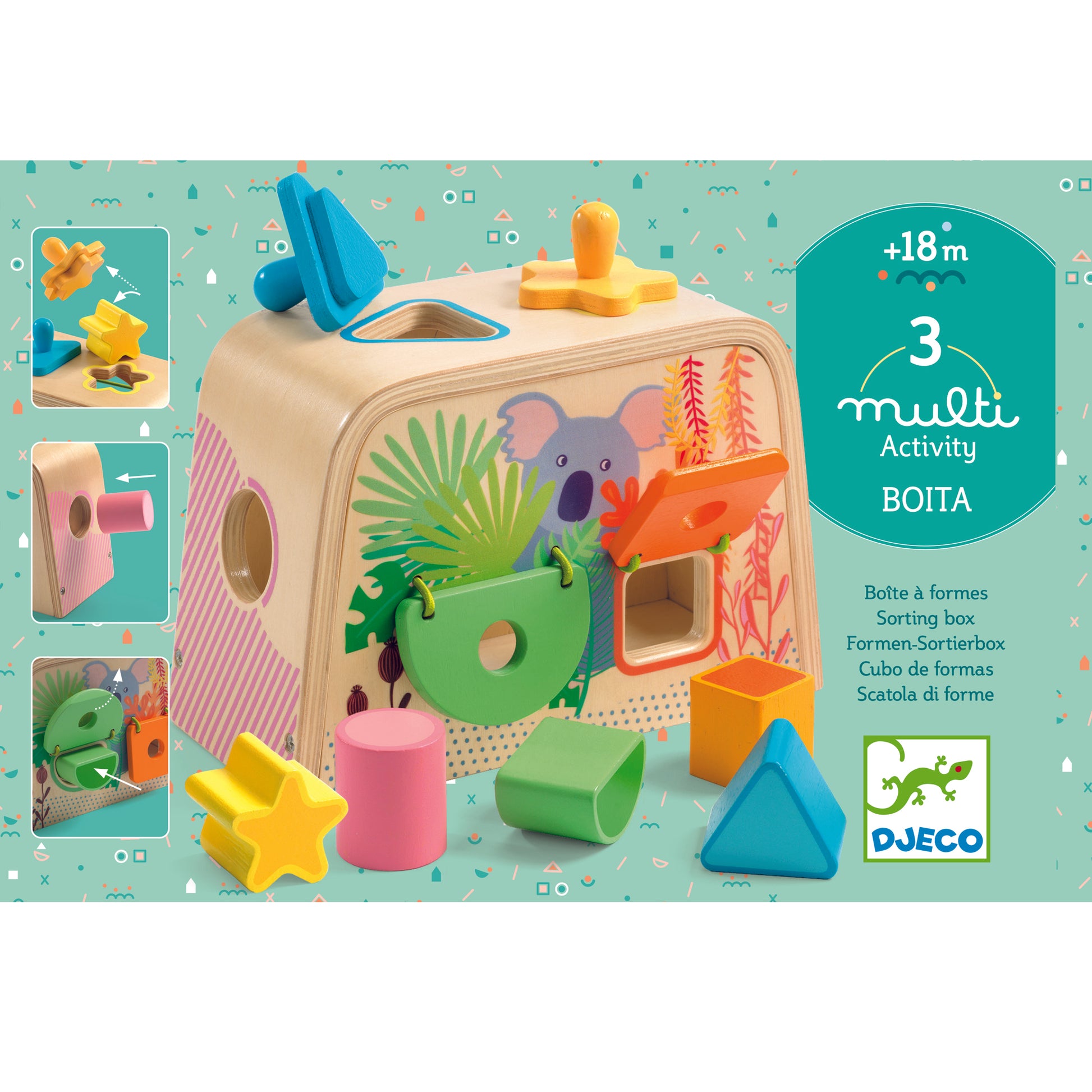 Multi Boita is a wooden shape sorting box where children can discover 3 different ways to fit geometric shapes into the matching holes. It is made up of 8 different coloured and shaped pieces to be sorted into the box. Slide the shapes into the matching holes, guided by their shape and their colour. Once complete, get the pieces back by reaching your hand through the big elastic cords on the back of the box.