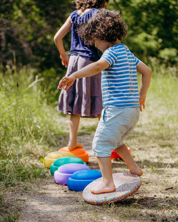 Stapelstein® Rainbow Set classic is the ideal Stapelstein® Set to start a motley adventure of movement. The Stapelstein® Rainbow Set classic combines the six harmonious colors of the rainbow. The motley Stapelstein® Board confetti classic is the perfect complement for dynamic-movement applications. With this colorful rainbowSet you experience the diversity of Stapelstein®.