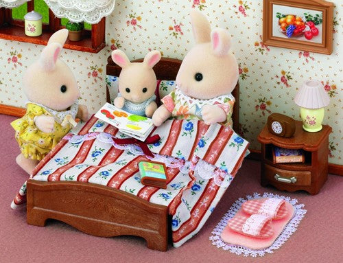 Suitable for ages 3 years and up Includes wide bed for two, side table, lamp, clock, and books.