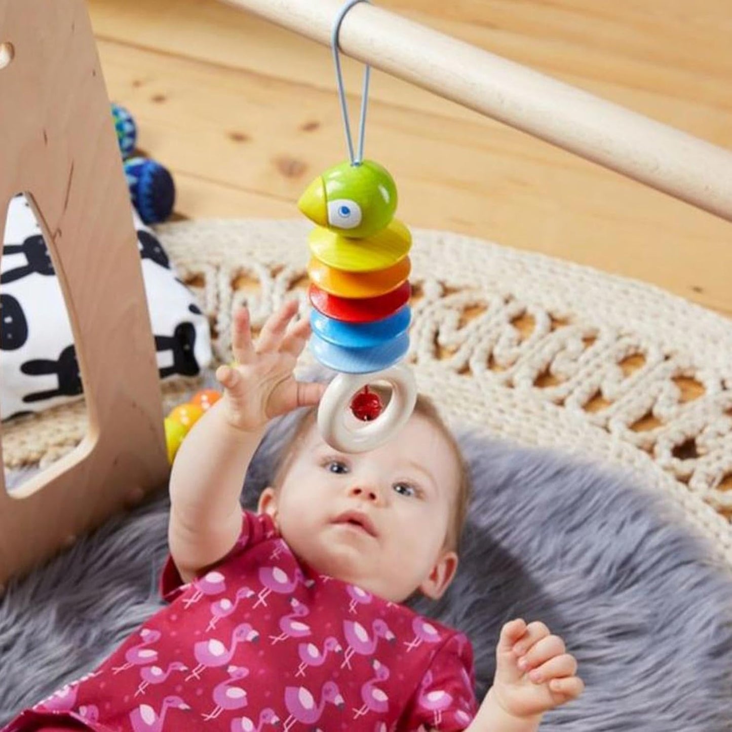 The colorful parrot invites babies to accompany it on an exciting journey of discovery. Its body has five rotatable wooden discs and a large wooden ring for grasping, touching and feeling. When baby touches the bell, it jingles merrily. With its highly practical strings, this dangling figure is easy to hang up anywhere. It keeps baby in a good mood at home as well as out and about. Features arouses baby's clutching instinct playfully promotes fine motor skills suitable for play gym, car seat, crib or stroller includes little bell