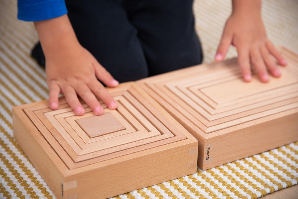 Beautiful smooth solid beechwood nesting rectangles in a natural finish to show the grain of the wood. The inner block is a solid 3D rectanglular prism.