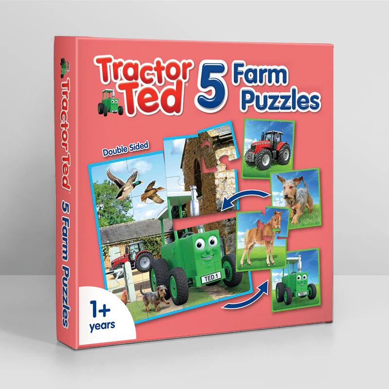 5 sturdy Tractor Ted puzzles in one box! Includes 4 x 4-piece individual puzzles featuring Tractor Ted and his real life farm friends and then, turn the puzzles over and make 1 x 16-piece farm scene!