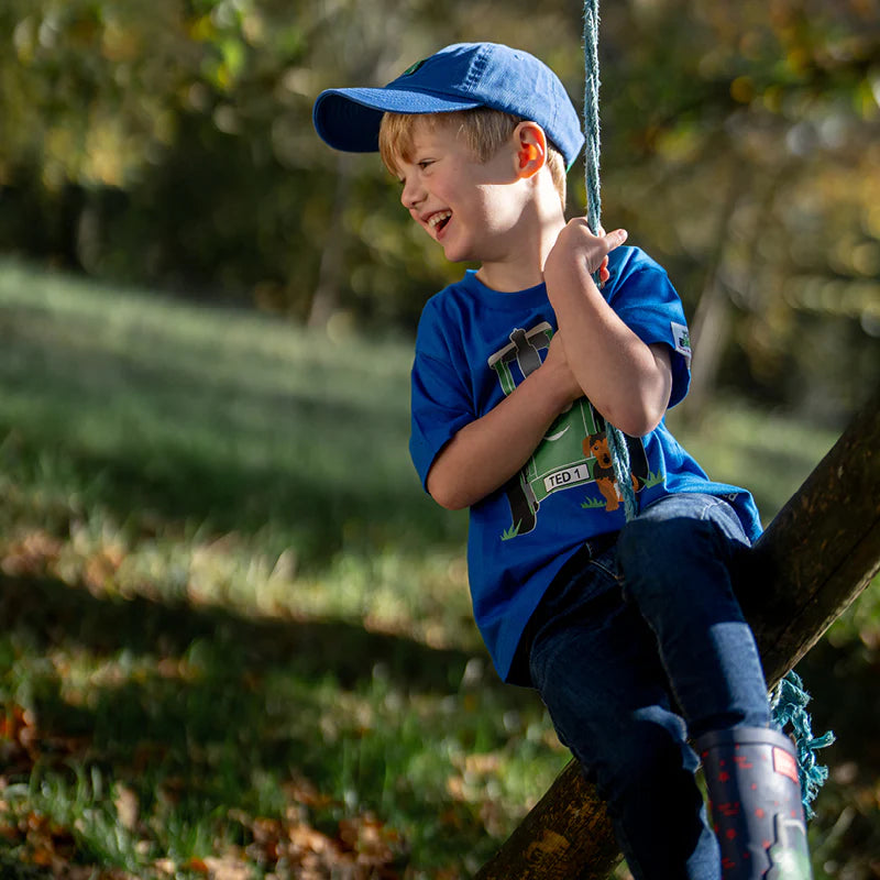 Our Tractor Ted Cap is the perfect hat for heading out and about on adventures. Tractor Ted is embroidered on the front and his name is on the back. In a blue vintage style cotton and with an adjustable contrast colour velcro strap.