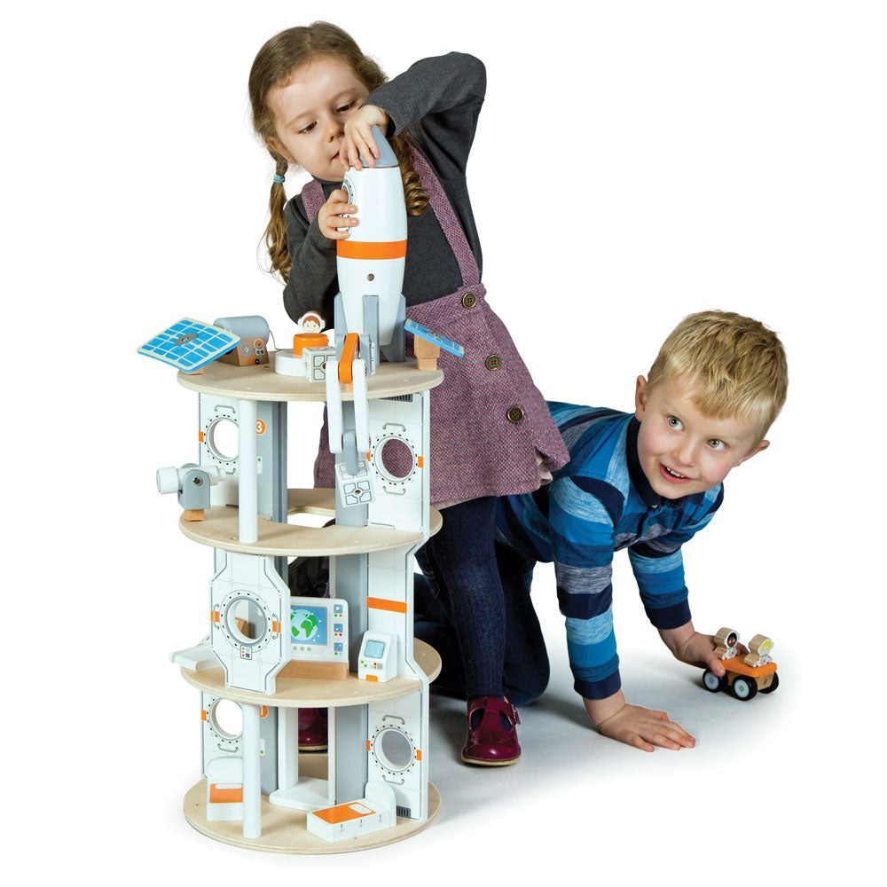Blast off into a universe of wonder with this 22 piece Space Station playset from Tidlo! Send your astronaut into space in the rocket, and as you are nearing your approach jettison the rocket's module and dock with the station's airlocks to climb aboard. Explore the station using the working lift, observe the stars with the telescope and computer equipment, visit the hydroponic garden and get some exercise on the treadmill. Use the space crane to move the storage cubes and samples about the station, and even take the buggy out for a spin! After a fun-filled, busy day, astronauts will need to get some sleep whilst the solar panels recharge, before refuelling the rocket ship to head home! But... Watch out for aliens! Plastic connectors allow interaction between the station and accessories. The rocket uncouples to simulate a real life rocket take off and docking. Hours of pretend play fun is sure to be had with this extensive set. A great way to encourage creative and imaginative play sessions. Requires adult assembly. Made from high quality, responsibly sourced materials. Conforms to current European safety standards.