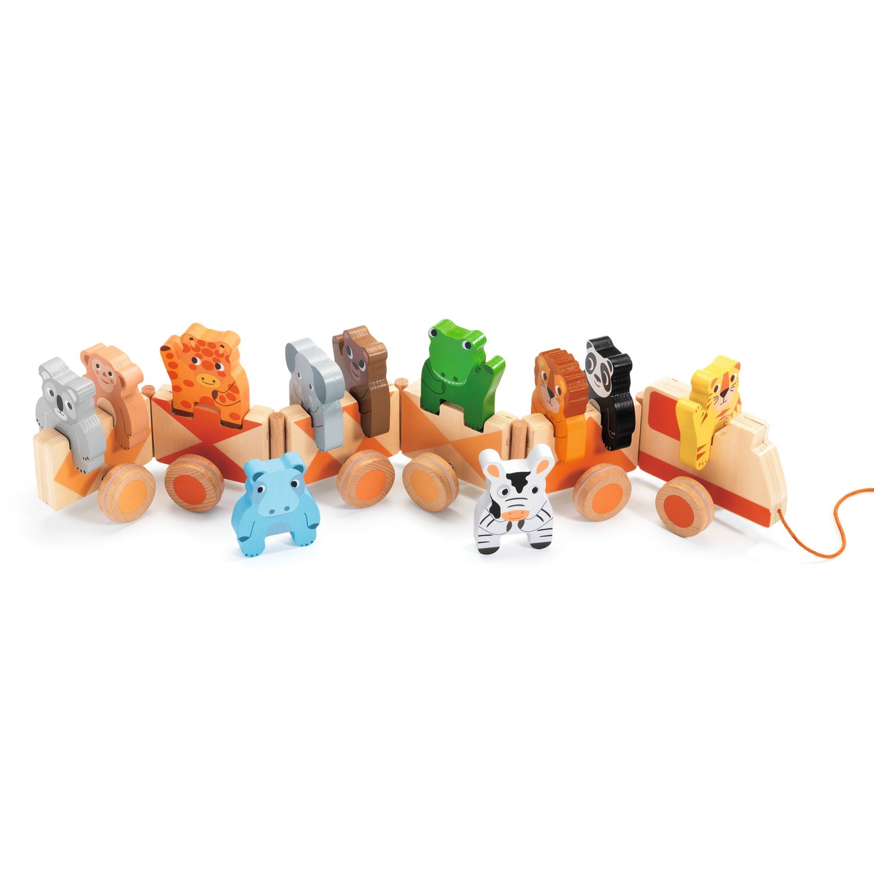 A large colourful wooden train with jungle animal passengers. Children can enjoy putting the 11 animals on the 6 carriages and pulling them using the cord. When not on the train, the animals stand upright and children can make up games to play with them!