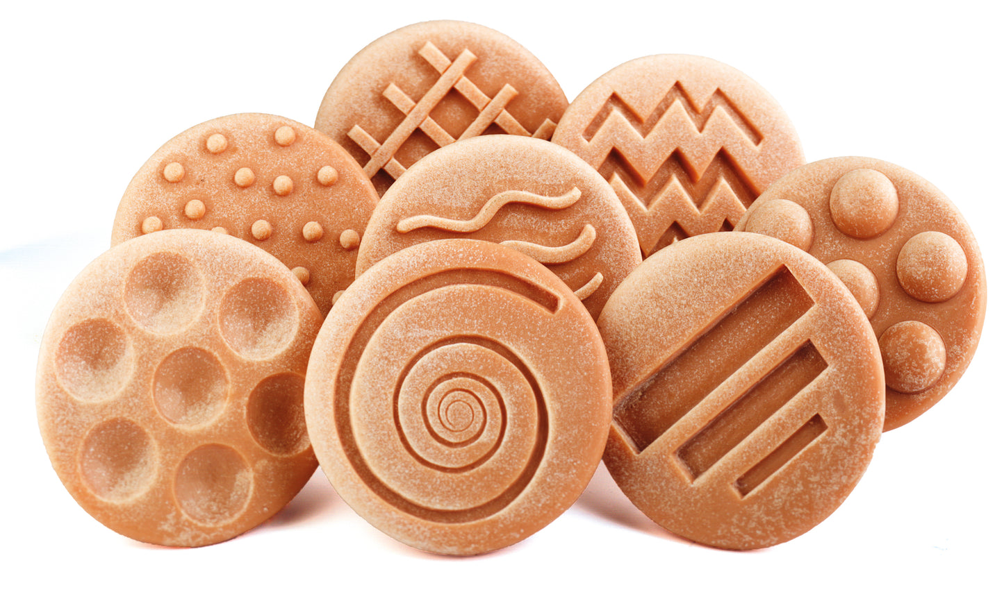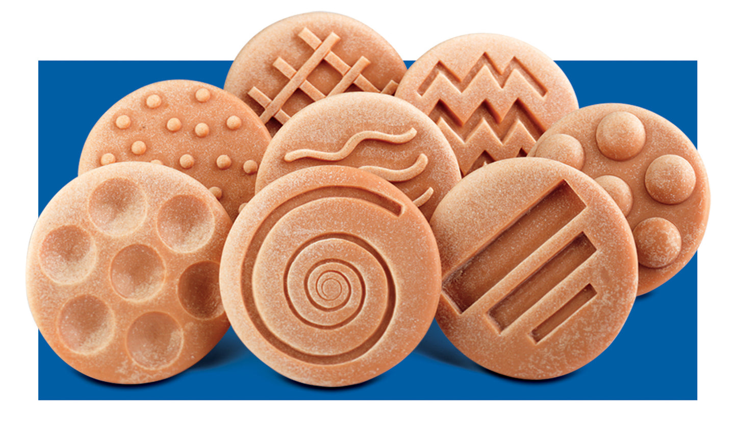 Children will love to experiment with the raised and indented patterns and shapes on these large tactile stones. The set of eight stones includes four raised designs (circles, dots, wavy lines and a grid) and four indented designs (circles, lines, zigzags and a spiral). Each stone measures 75mm. Age 2+.