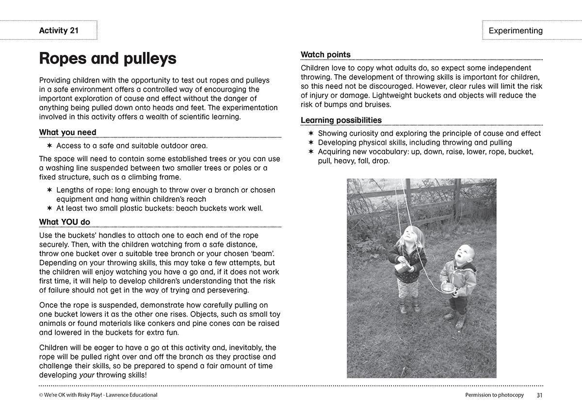 The ideas in this book will inspire you and give you the confidence to view risk as an integral part of children's play. With advice on best practice for managing risk safely, this book will help you to embrace the potential learning possibilities, both indoors and outside. Along with clear and supportive guidance, the book contains 50 exciting activities in four sections: creating, experimenting, exploring and experiencing. These sections cover topics ranging from kitchen and campfire activities, using tools and equipment, physical challenges, expedition ideas and many more. Each comprehensive activity has an introduction, a list of what you will need, guidance on the activity itself, what your role may be, any points to watch out for and the learning possibilities on offer.