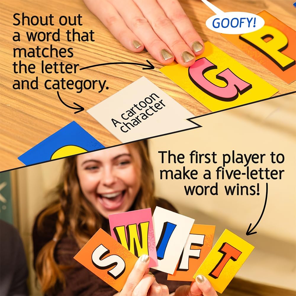 The gameplay is easy to learn. A category card is flipped and letter cards are dealt out. Players must quickly spot a valid word that matches the category using one of the available letters, shout it out, and grab the letter. Speed is key, as the slowest player may miss out if all the letters are taken. The game continues until a player successfully forms a five letter word from the letters they have collected to win the game.