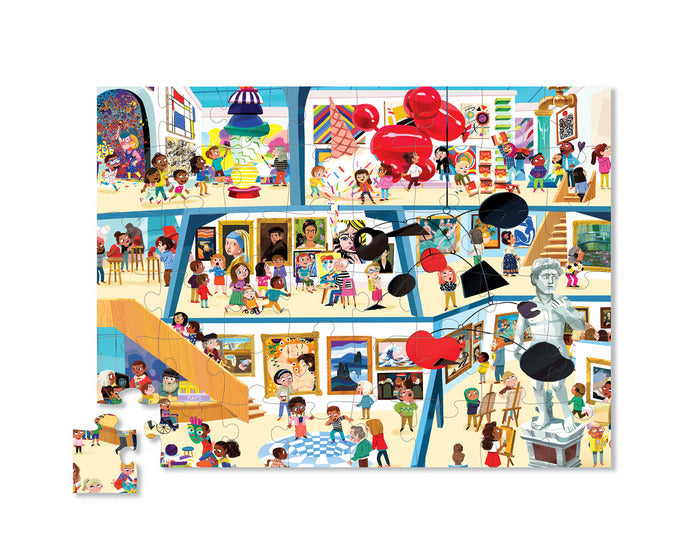 Crocodile Creek's Day at the Art Museum 48 piece puzzle will transport you to a fun, whimsical art museum. This observation puzzle features inspired artwork from famous artists in a art museum setting. Richly detailed puzzle is 18" x 24" when complete. The uniquely shaped packaging makes storing this puzzle even more fun. All Crocodile Creek's puzzles are printed with soy-based ink on recycled cardboard.