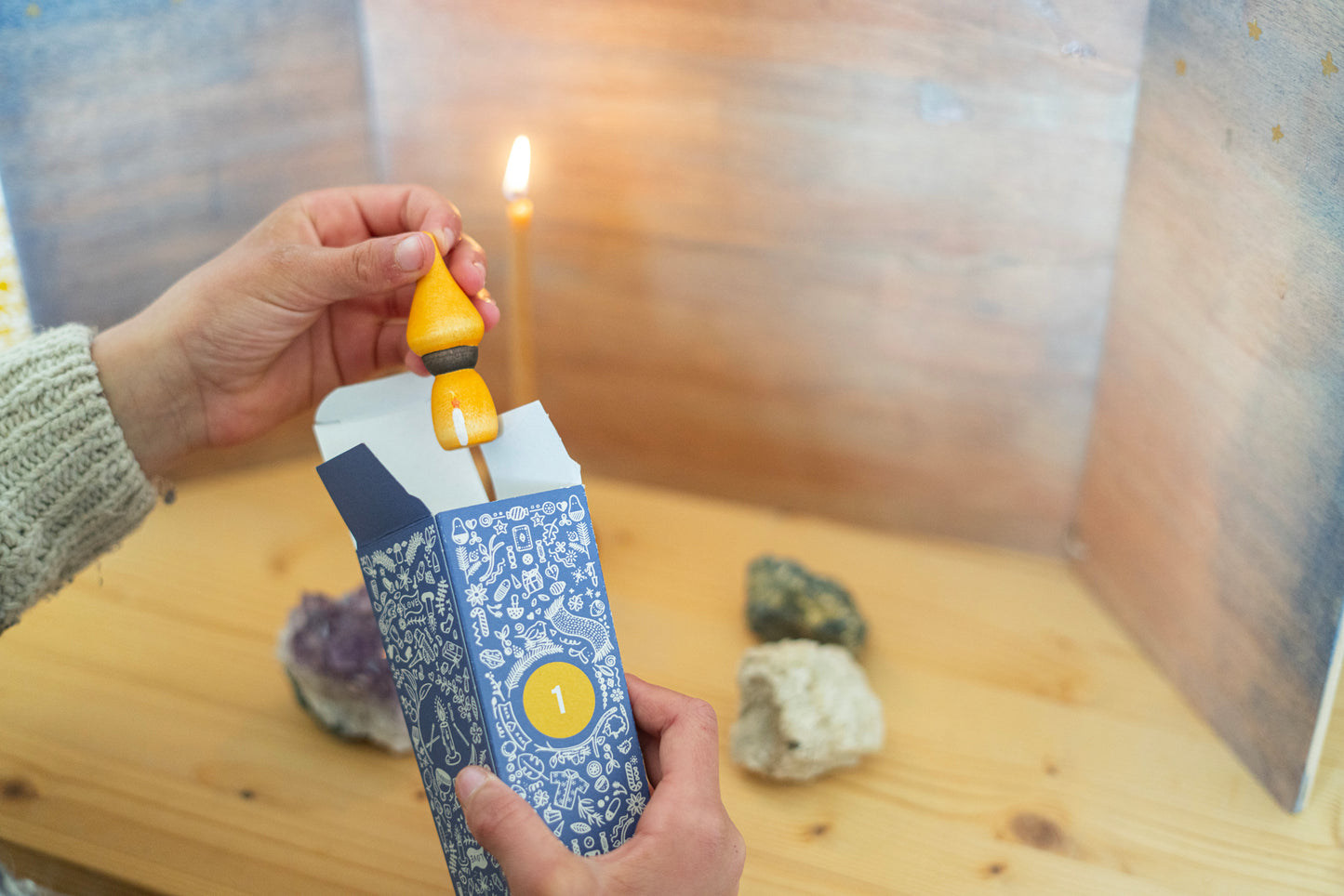 More than 150 pieces in different materials: wood, fabric, threads, wool, and much more. The box also includes a book with invitations to play, craft and share time together. It’s presented in 8 languages from which you can choose (each book includes 1 language except Catalan-Spanish). Catalan+Spanish, English, German, Italian, French, Japanese, Dutch & Chinese. In the box you can also find an original cardboard circle to be used as a display of the pieces once the boxes are opened day by day.