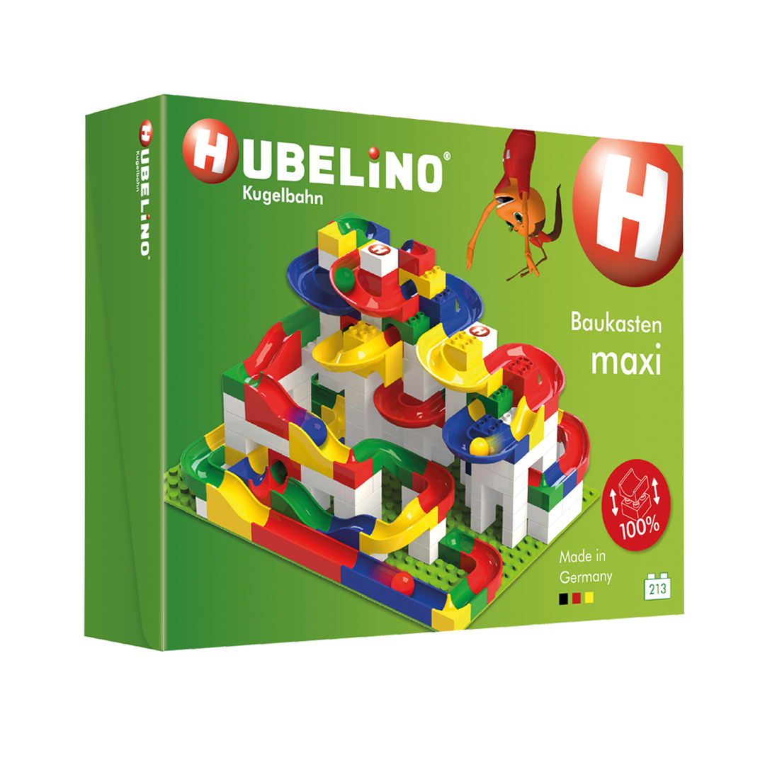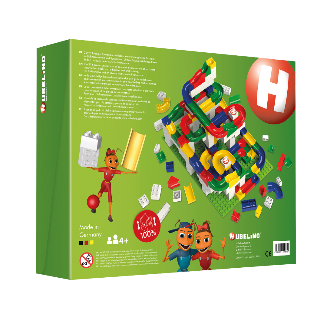The 213-piece Big Building Box is ideal for the Hubelino marble run beginners, that want to start big. It contains all necessary elements for building dynamic and spectacular marble runs: a large base plate, numerous building blocks, many different run elements, including the new left and right slides and marbles. Our instruction booklet with five different marble run designs can be used for simple inspiration or as a sample. The set comes in a solid cardboard carrying case with partitions for storing your bricks and carrying them to play eveywhere you go. Build tracks with the interlocking segments and recreate the models in our tutorials or experiment with your own designs.