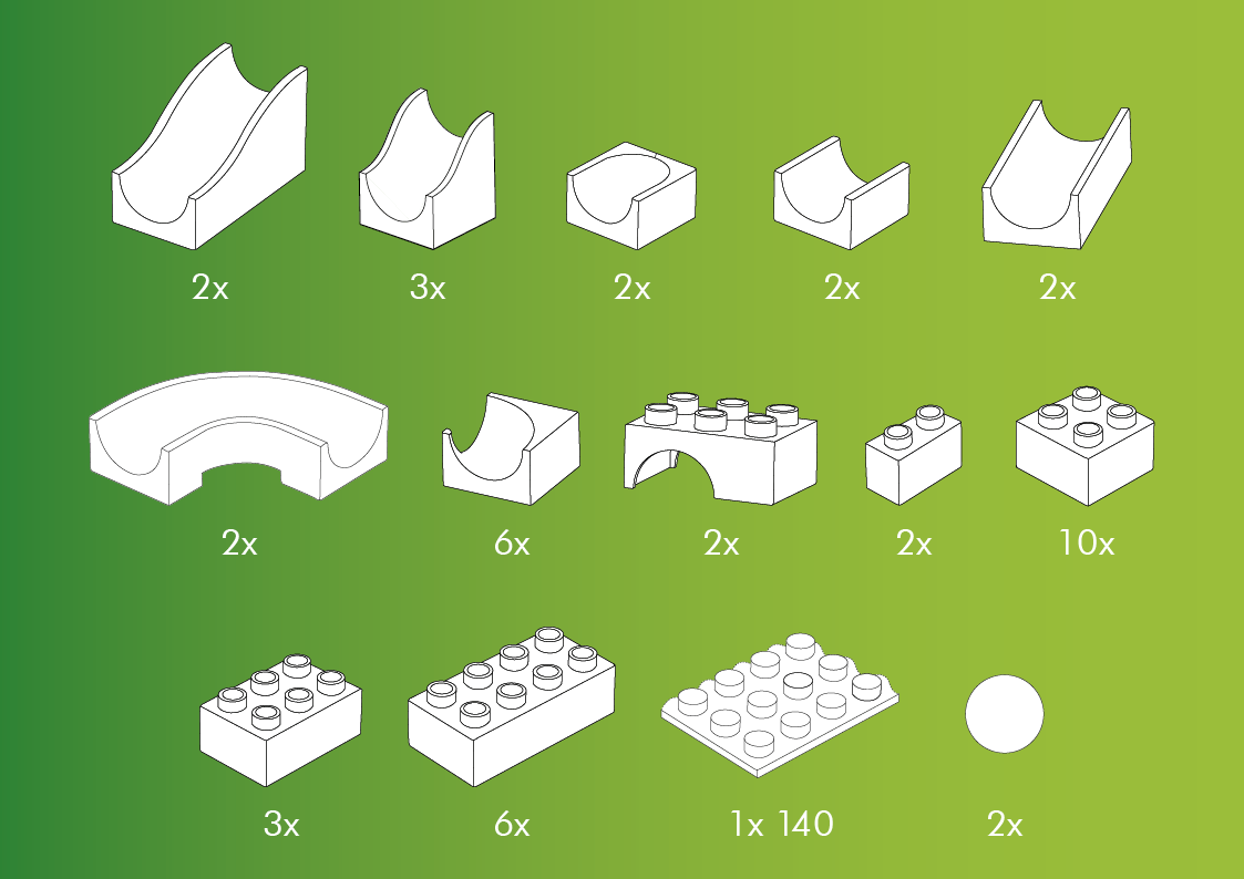45 pieces (21 run elements, 21 building blocks, 1 base plate, 2 marbles) + Instruction booklet