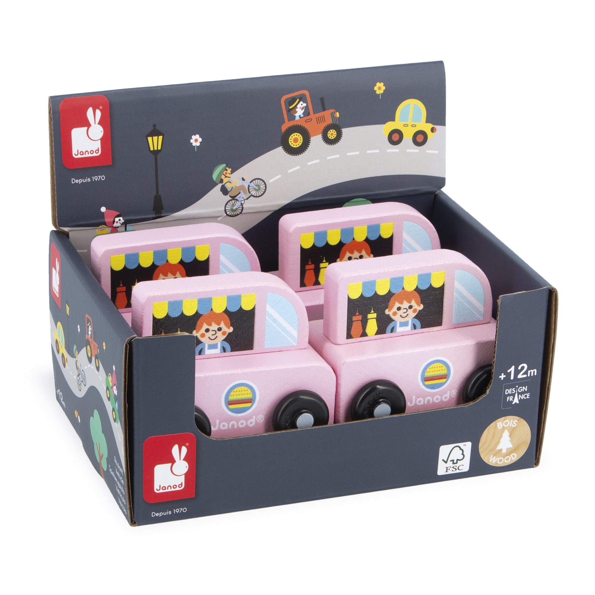 2 hamburgers, 1 doughnut and 1 strawberry ice cream, please! This food truck travels around the city, much to the delight of its customers, helping create lots of stories! The vehicle shape has been designed for better grip. Toy made from FSC™ wood for children aged 12 months and up. Combine this push-along car with its mat and cool block set in the same Janod range to perfectly complete the universe.