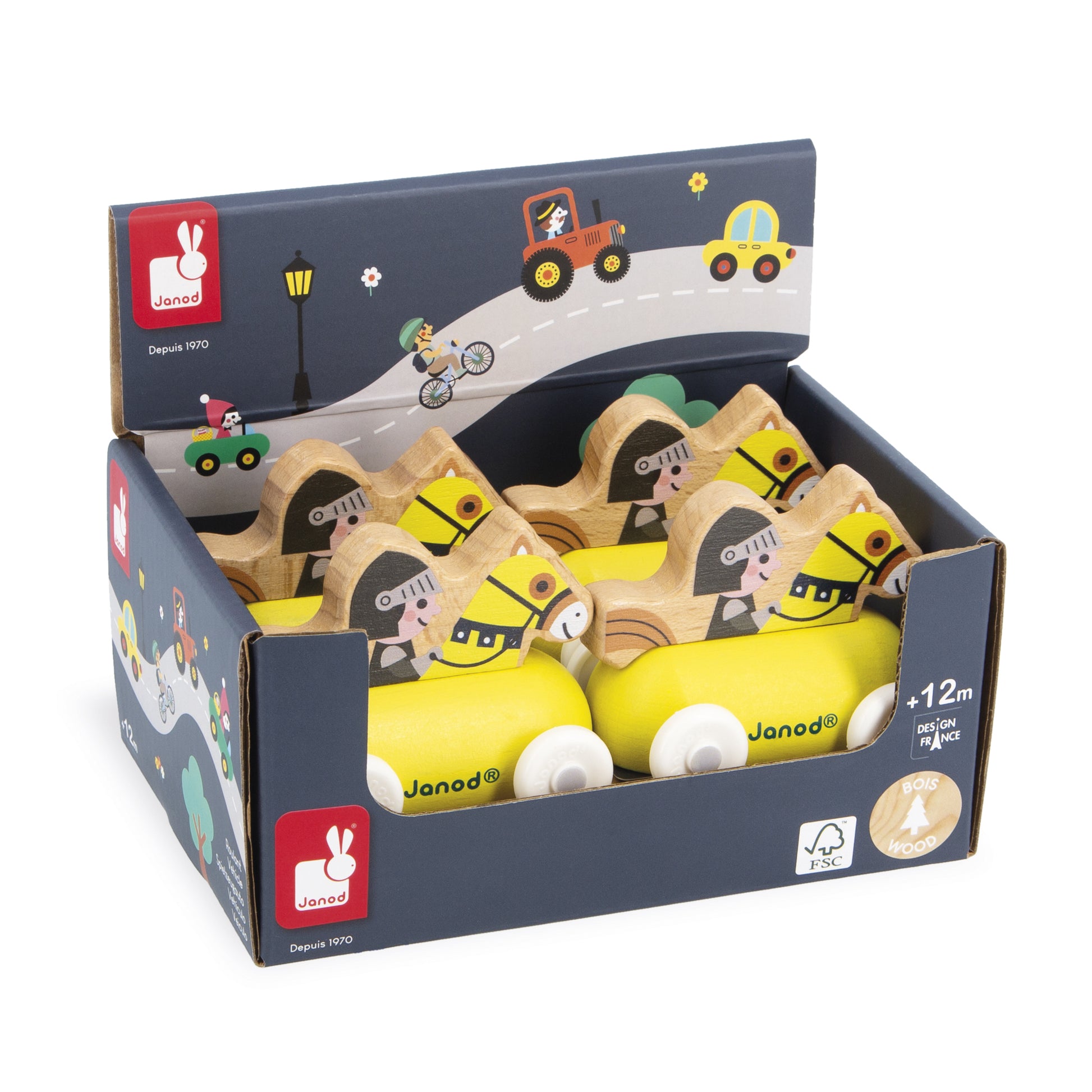 The knight and his horse are ready for the big tournament! Create countless stories with this knight-shaped push-along vehicle! Thanks to its shape, this push-along vehicle can easily be grasped by little ones. Toy made from FSC™ wood for children aged 12 months and up Combine this push-along car with its mat and cool block set in the same Janod range to perfectly complete the universe.