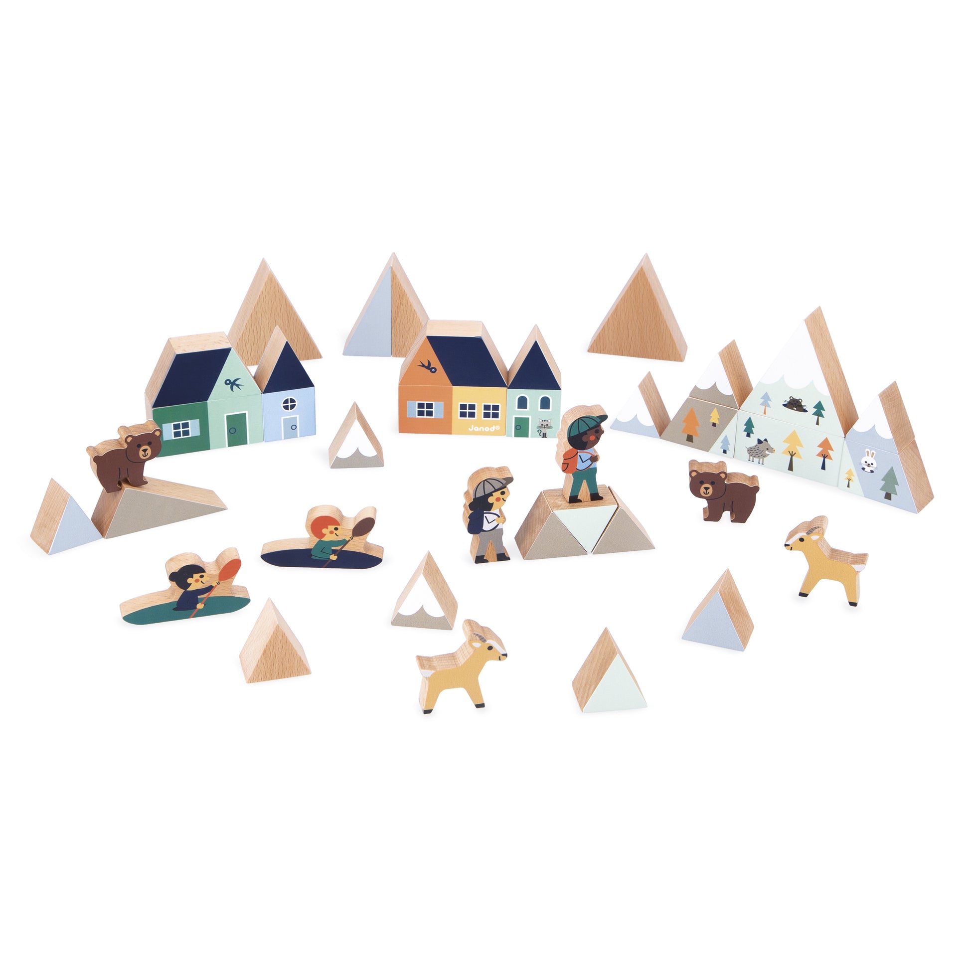 Build the highest mountain possible, invent a cute little village at the bottom of it and set off to climb the summit! You might even stumble across a bear or ibex! This awesome set of soft-coloured solid wood blocks lets children build and invent a large mountain valley with a pretty colourful village to boot. Thanks to the characters and animals included in the box, children will be all set to invent many a great story. This set includes 26 building blocks and 8 characters/animals. The clever storage box with its sliding lid can be used to store all the pieces like a puzzle. Simply follow the diagram on the bottom of the box. The ideal toy for developing imagination. Construction toy made from FSCTM-certified wood for children aged 2 years and up. Combine this set of blocks with a mat and cute vehicles in the same Janod range to perfectly complete the universe.