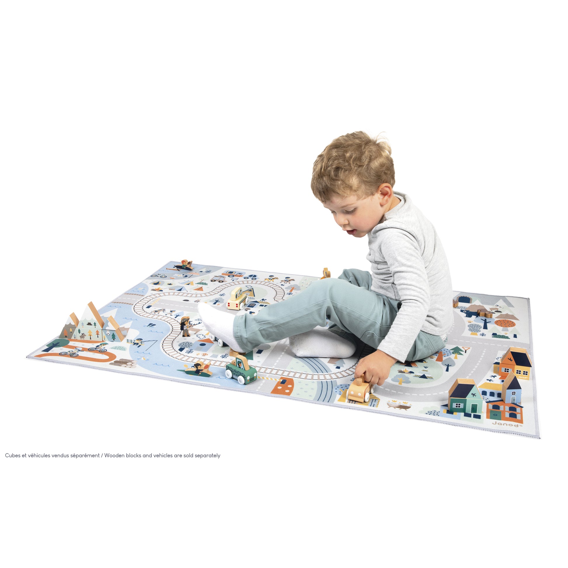Onward budding adventurers! In this mountainous valley, travel from landscape to landscape aboard the train or by taking the winding valley roads. The more active visitors can cycle up the passes or go hiking to discover different mountain animals. This soft-coloured, nature-themed mat is perfect for inventing many a great story. Besides stimulating the imagination, this playmat also serves as a fun seek and find game. Can you find the cat? Little ones are sure to expand their animal, number and shape vocabulary. An added extra: the mat is non-slip! Children will be able to easily push their small vehicles on the mat and play with complete peace of mind. Pretend play toy for children aged 2 years and up. Fill the mat with a wide array of cute Janod vehicles and wooden blocks. It can also be used alongside the other mats in the range to create a giant play space!