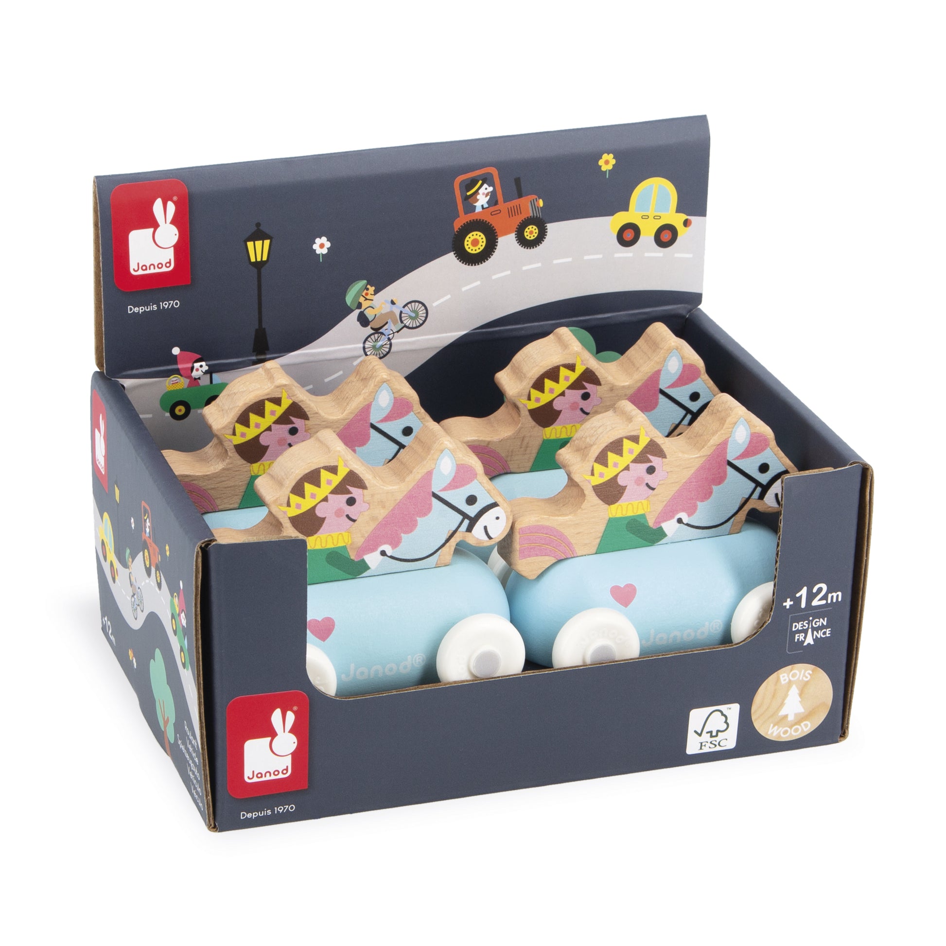 The prince is riding his horse throughout the kingdom. Little ones can invent countless stories with this push-along vehicle. The vehicle shape has been designed to give toddlers a better grip. Toy made from FSC™ wood for children aged 12 months and up. Combine this push-along car with its mat and cool block set in the same Janod range to perfectly complete the universe.
