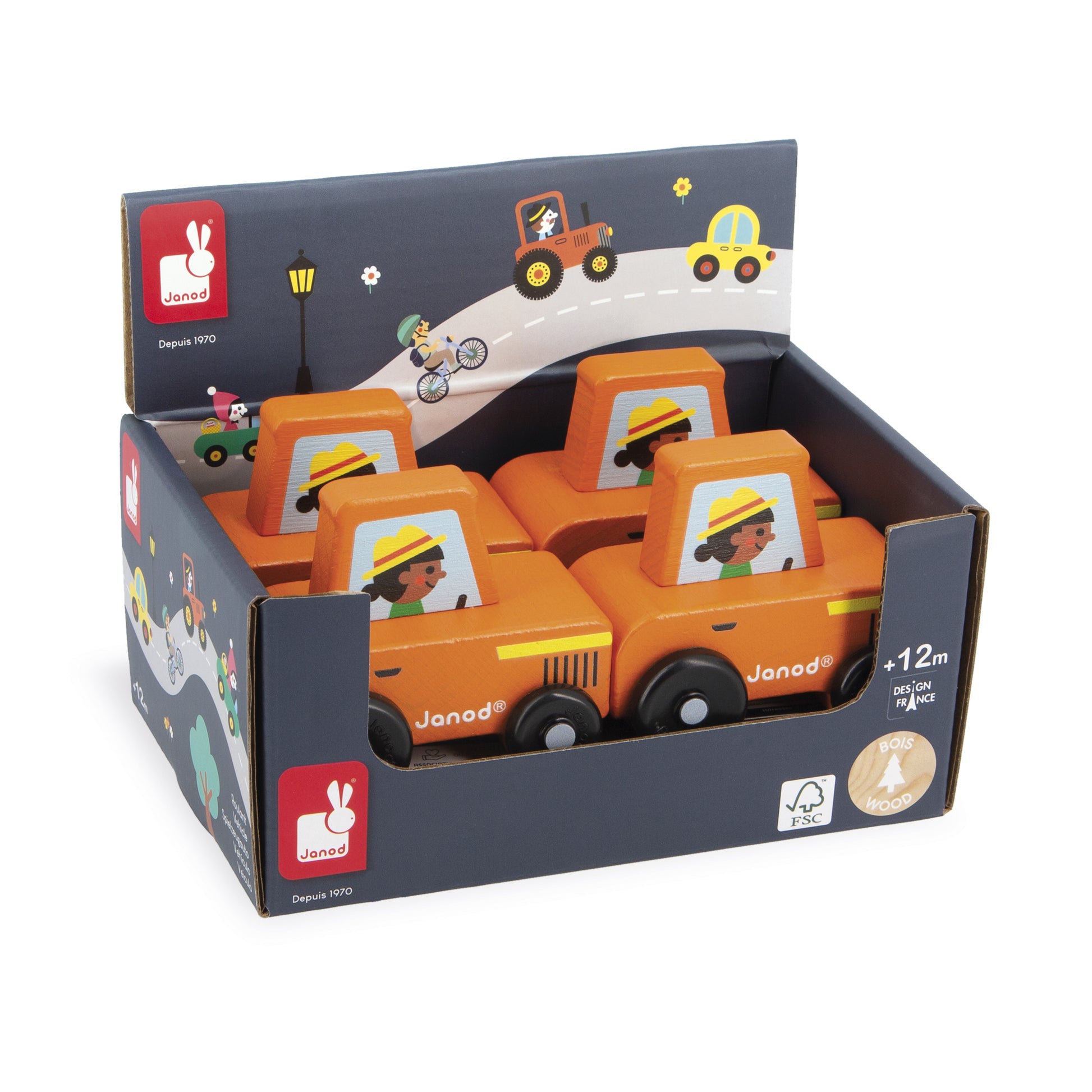 Climb aboard the tractor so we can transfer the cows to the meadow! Invent great farmyard stories with this wooden tractor. Thanks to its shape, the tractor can easily be grasped by little ones. Toy made from FSC™ wood for children aged 12 months and up. Combine this push-along car with its mat and cool block set in the same Janod range to perfectly complete the universe.
