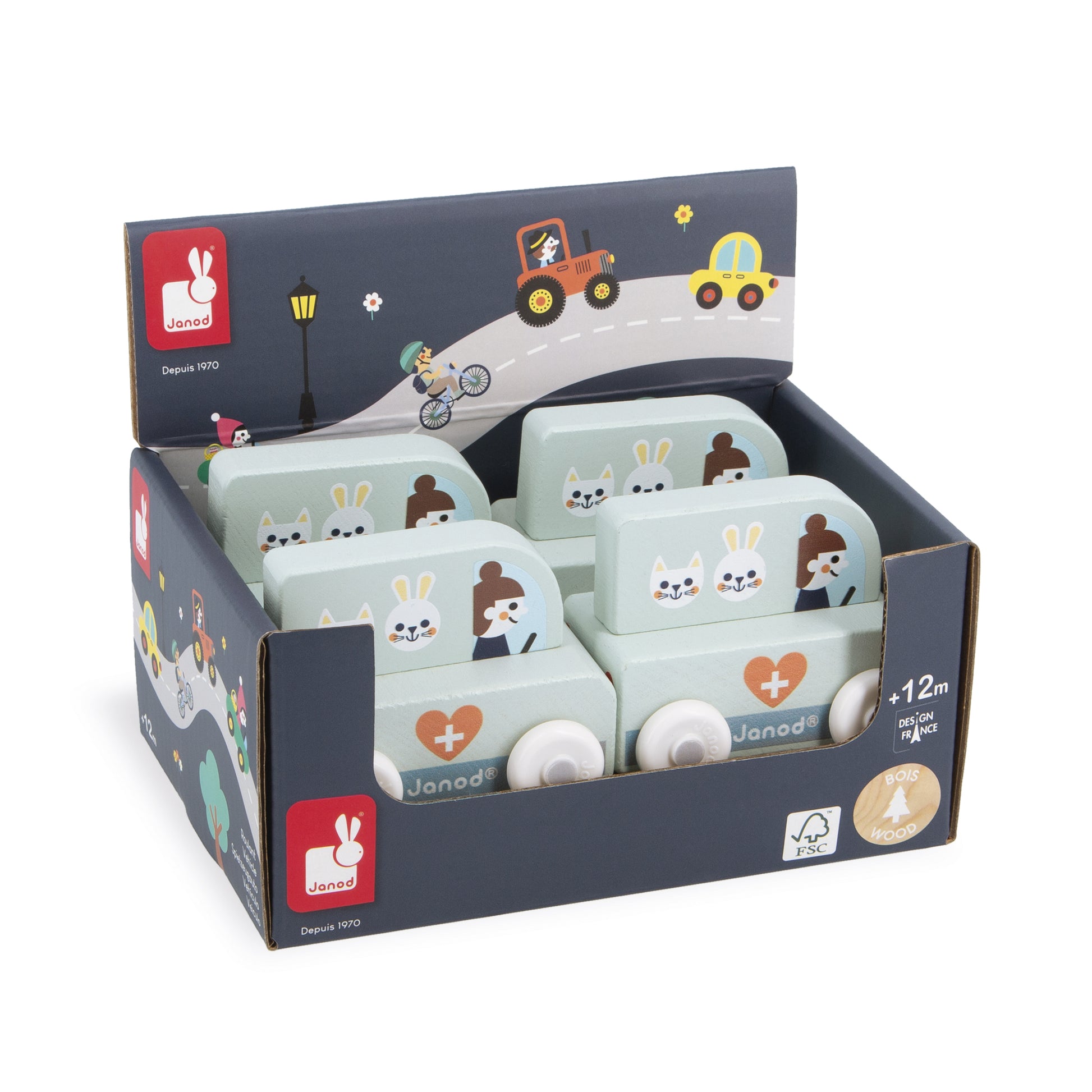 Hurry! There’s an emergency on the farm, the vet must hurry to try and save the animals! Many exciting adventures can be created with this veterinary truck. Thanks to its shape, this push-along vehicle can easily be grasped. Toy made from FSC™ wood for children aged 12 months and up Combine this push-along car with its mat and cool block set in the same Janod range to perfectly complete the universe.