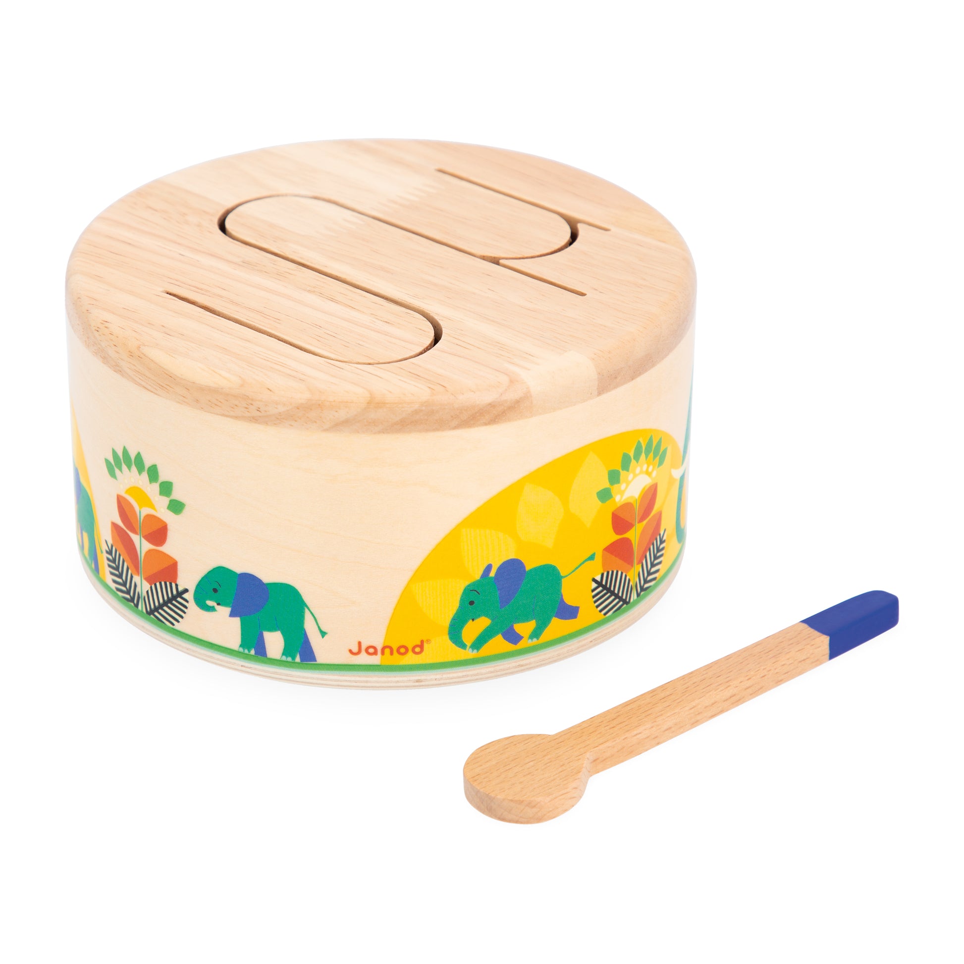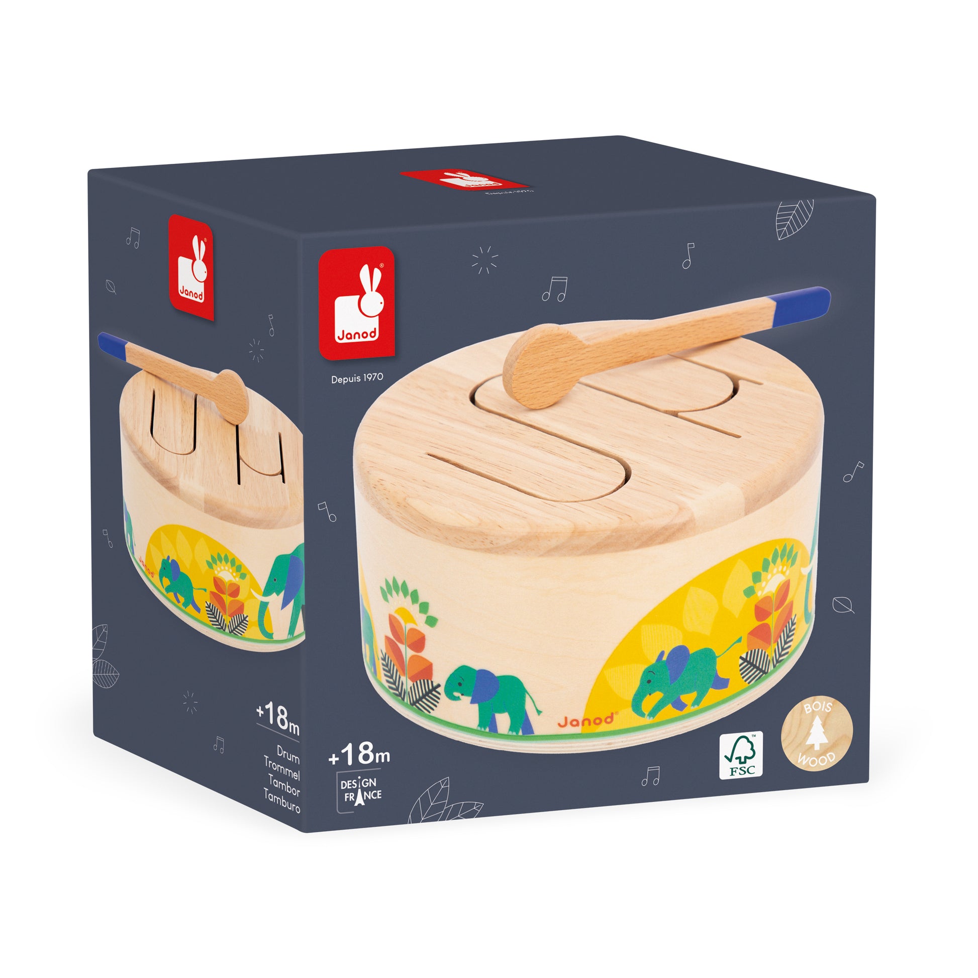 Rat-a-tat-tat! This wooden drum will help your child develop their sense of rhythm and hand-eye coordination, thanks to the wooden drumstick included. This rounded imitation toy is easy to carry and sounds when the child taps on it. Its wave-shaped pattern allows different tones to resonate, ideal for introducing children to rhythms and sounds. Early-learning toy for children from the age of 18 months.. Toy made from FSCTM wood.