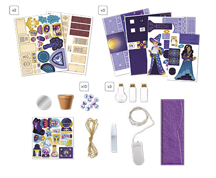 Build your own sorcerer’s workshop! This creative kit allows you to make a real miniature sorcerer’s workshop right inside the box. You can assemble and glue the tiny world, then decorate it with a string of lights. Once it's finished, you can also play with it using the characters provided. It contains 5 pre-cut cardboard sheets, 2 pre-cut sheets of paper, 1 pre-cut sheet of felt, 1 tube of glue, 1 string of lights (batteries included), 3 glass vials, 1 self-adhesive mirror, pearl beads, gold string, 1 terracotta pot and 1 booklet with instructions and designs. This activity helps develop patience and dexterity and takes around 2 hours. It is ideal for children aged 8 and over.