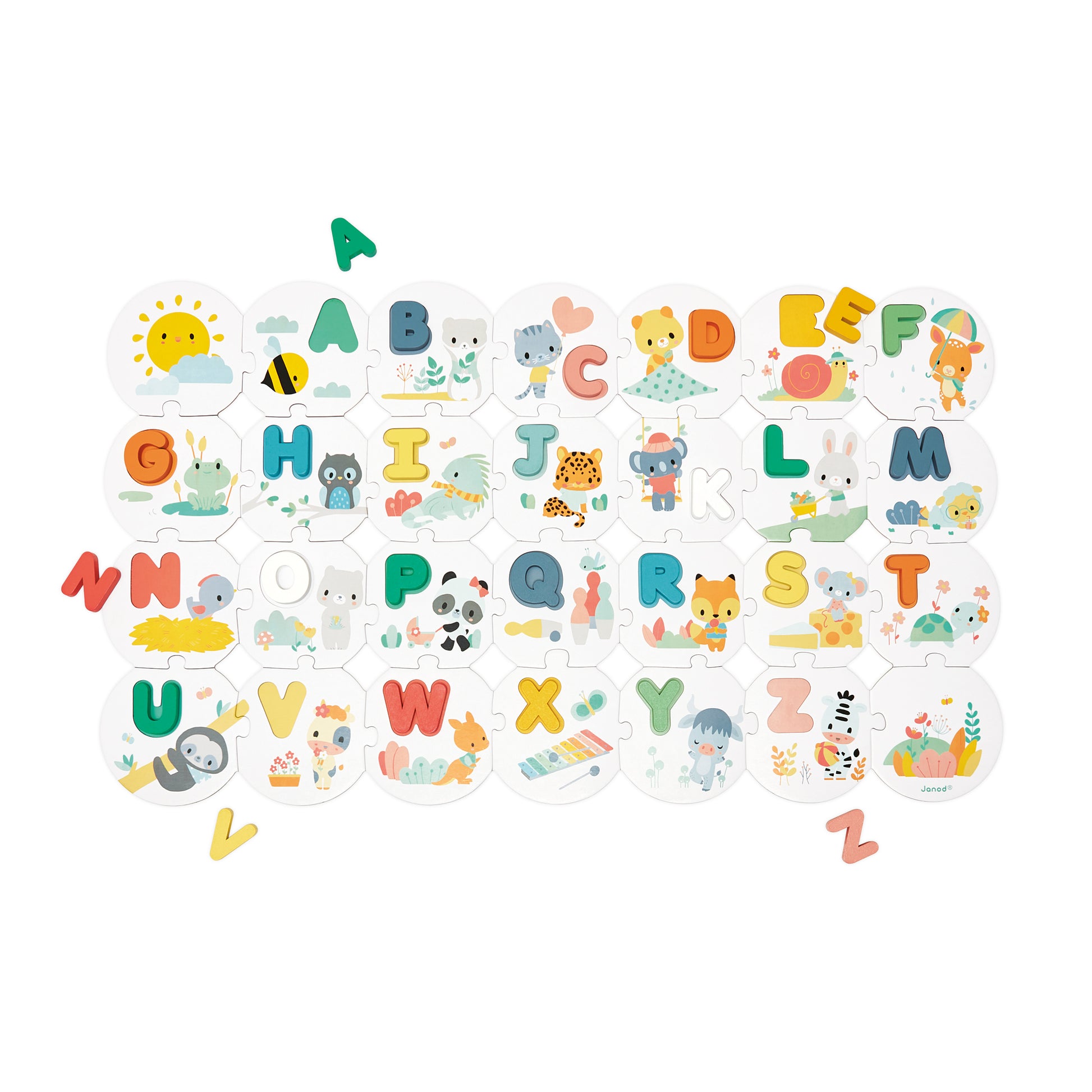 Learn the alphabet without seeming to! Each puzzle piece corresponds to a wooden letter. It is the first letter of the associated illustration… B for Belette (weasel), D for Doudou, U for Unau (little sloth) or W for Wallaby (little kangaroo)… Your child will learn the alphabet while having fun! A template is provided to help little ones. Ideal for developing fine motor skills and memory. Early-years toy made of FSCTM wood and cardboard, for children from 2 years.