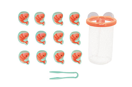 12 little shrimp have escaped into the bath, you have to catch them quickly! Using the tongs, your child can catch each shrimp that floats on the surface of the water and place them in a pretty basket that attaches to the tiles with suction cups. This game will allow your child to develop dexterity while having a fun time in the bath. Bath toy for children aged 2 years and over.