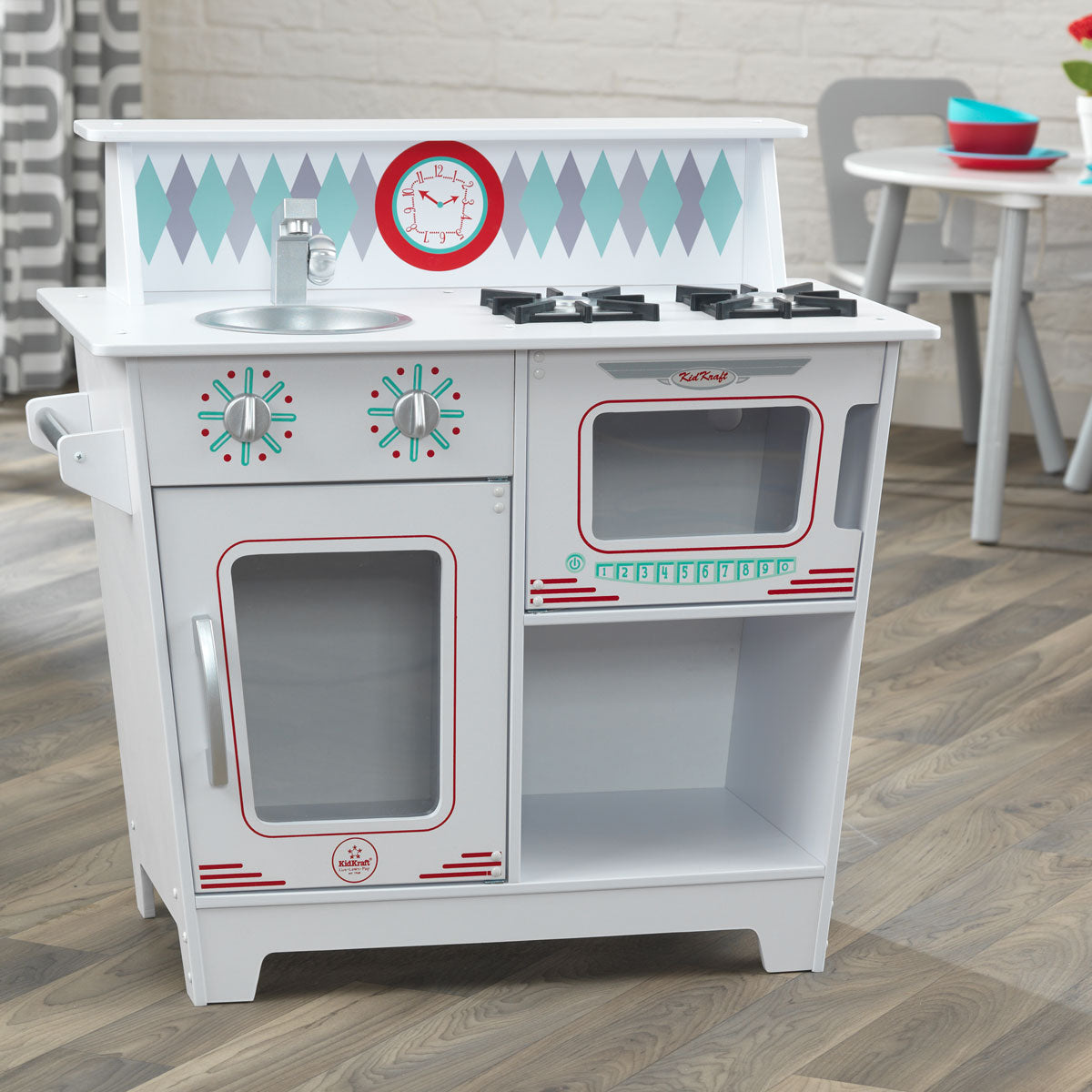 The KidKraft Classic Kitchenette has everything your little chef needs for fun and imaginative play! The bright colors and adorable design of this play kitchen will get kids cooking and having fun. Realistic burners and clicking, turning knobs complete the interactive experience. Plus, this kitchen's durable design will ensure years of fun and safe playtime. Who knows what imaginative delights this kitchenette will inspire?