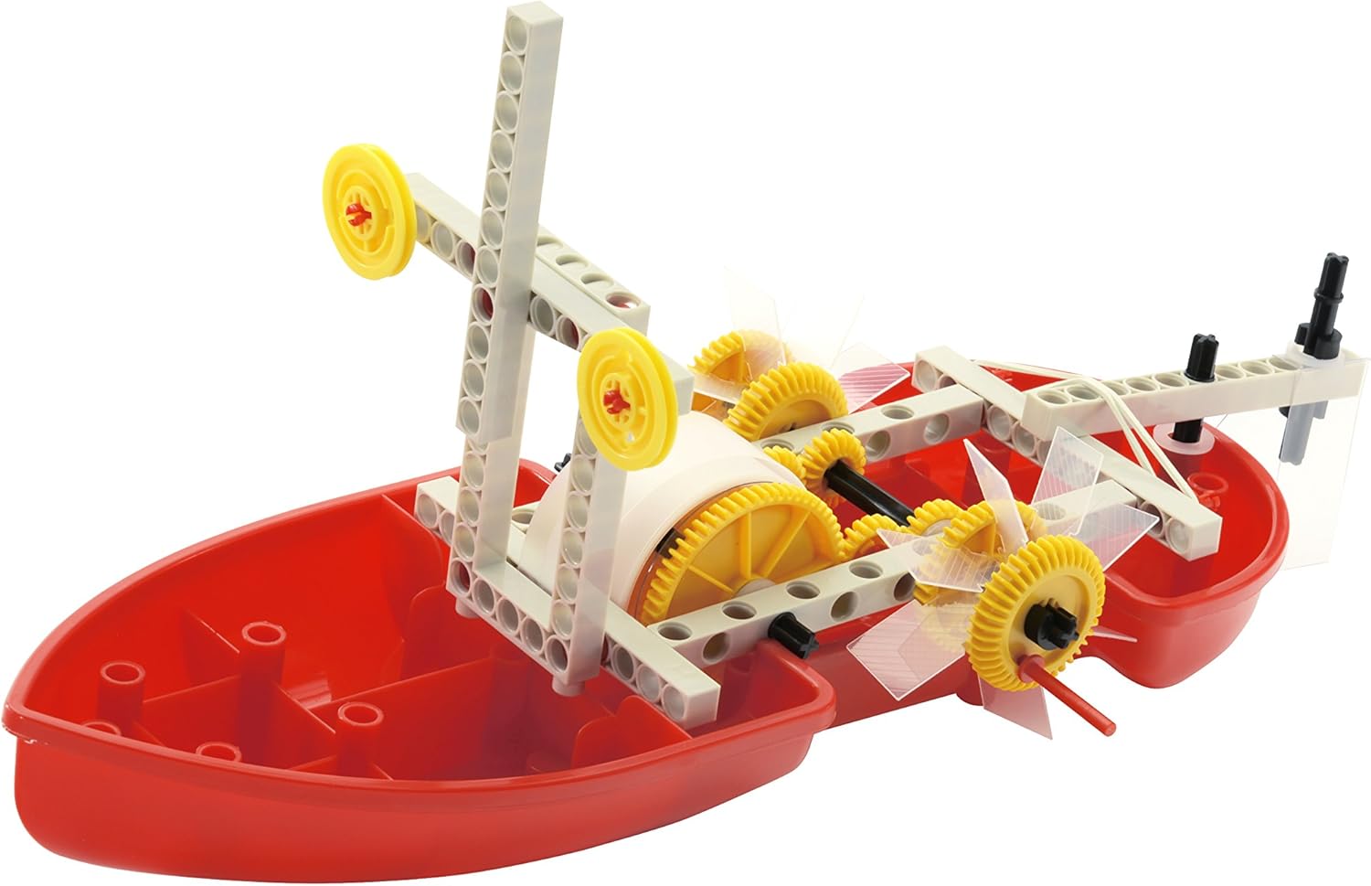 Physics Pro is our biggest, most advanced physics kit. With this kit, you can continue your study of statics and dynamics from previous lessons and begin your study of more advanced topics in physics, including fluid dynamics, energy, oscillation, hydraulics, and pneumatics. By adding advanced topics like fluid dynamics to your physics repertoire, you can now build some really spectacular models and devices, such as a wind tunnel, pneumatic shocks, and a hydraulic lift. You will see how physics extends far beyond the classroom, giving us an amazing set of tools that can be applied in the real world to engineer marvellous things. The main focus of the kit is the behaviour of the two most important fluids in our world — water and air — and objects immersed in them. You will investigate how air and water rest and flow, what they can carry and how they move. With experiments and models, you will find out what forces work on them and what kinds of energy they possess. You will learn how ships float and airplanes fly, why a streamlined shape lets a car drive faster and how power plants convert a current of water into electrical current. The 96-page, full-colour experiment manual has two major sections. In the first part, you will enter the physics lab, where you will get to know the properties of air and water and become familiar with currents and energy. There is a series of 17 experiments in which you will start building smaller models. In the second part, you will move on to the workshop, where you will build 14 larger models of complex real-world devices. More than 212 parts are included in this kit, which are compatible with our other Physics kits.