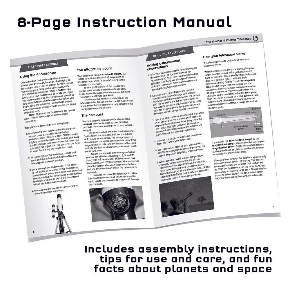 Set your sights on the Moon and beyond! With this excellent entry-level telescope, Thames & Kosmos continues a long tradition of inspiring people to reach for the stars. This high-quality refractor telescope with glass optics allows for countless exciting space observations. With it, you can see the Moon and its craters in good detail; Mars, Saturn, Jupiter, and more! Terrestrial observations on Earth are also possible. The included instruction manual guides you through setting up and using the telescope.