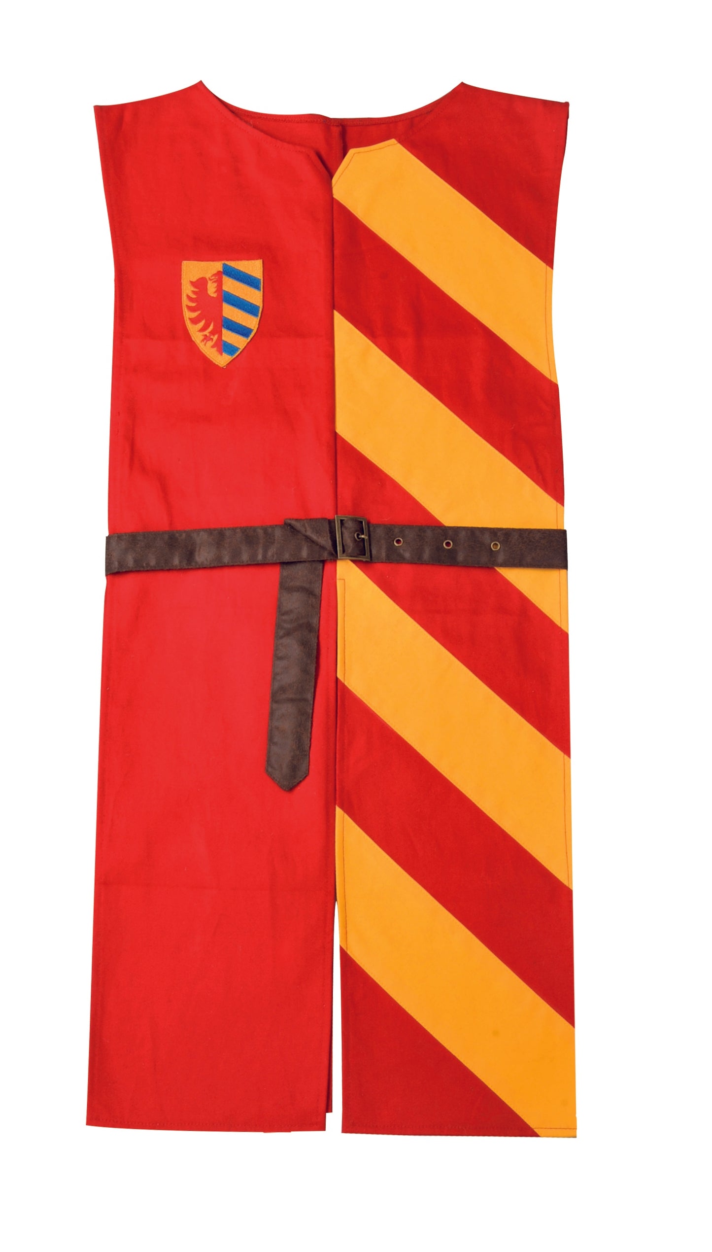 Belted Lancelot tabard in durable cotton. The coat of arms of the knight of the table is sewn into the left side, yellow stripes run diagonally on a red background on the right side. The tabard is suitable for little knights from 5-12 years.