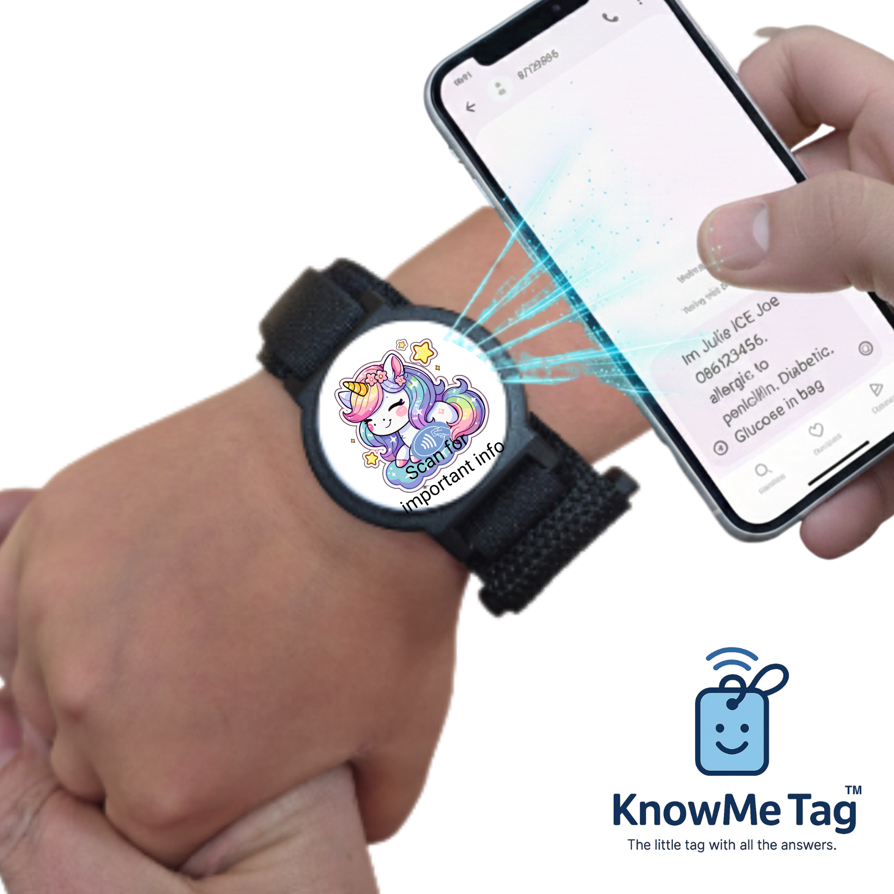 The KnowMe Tag™ Velcro Bracelet is designed to fit every wrist—young or old, big or small. With its soft, adjustable strap and discreet NFC tag, it’s a gentle way to carry essential information wherever life takes you.